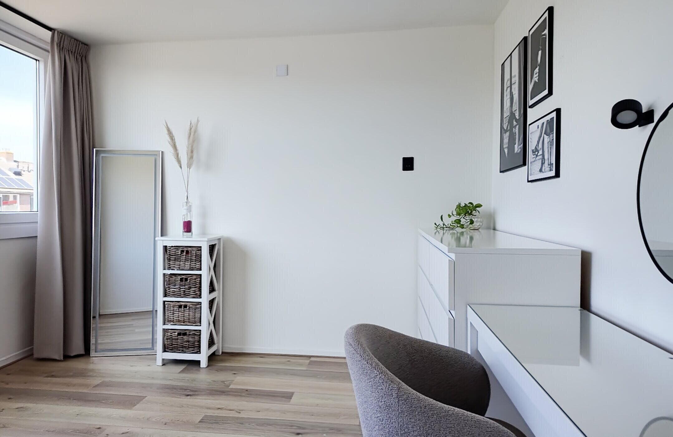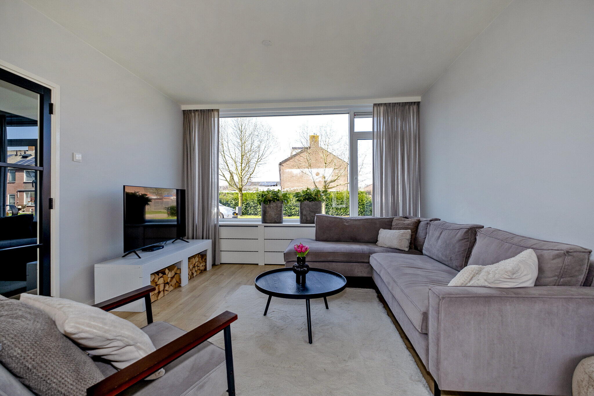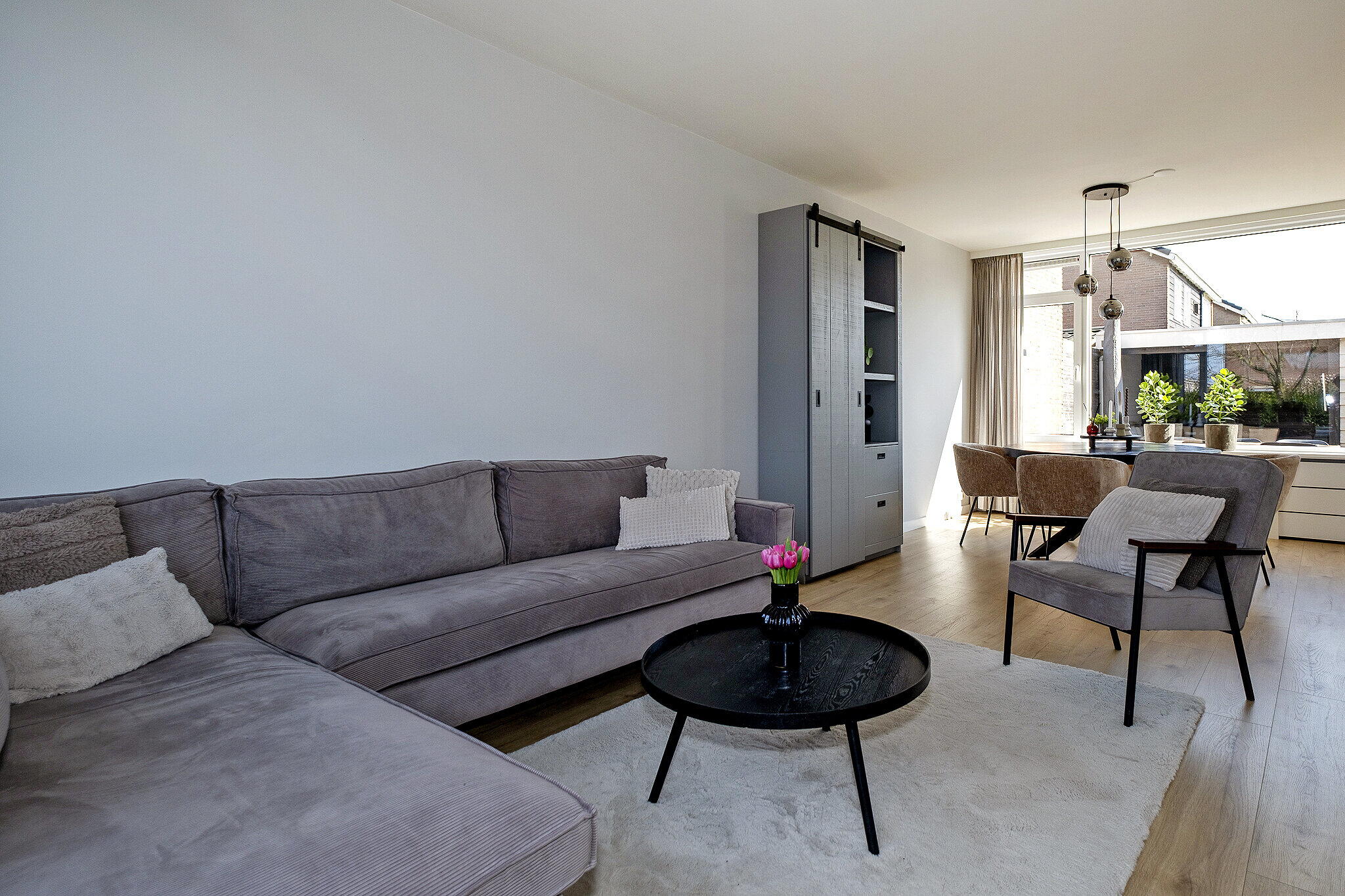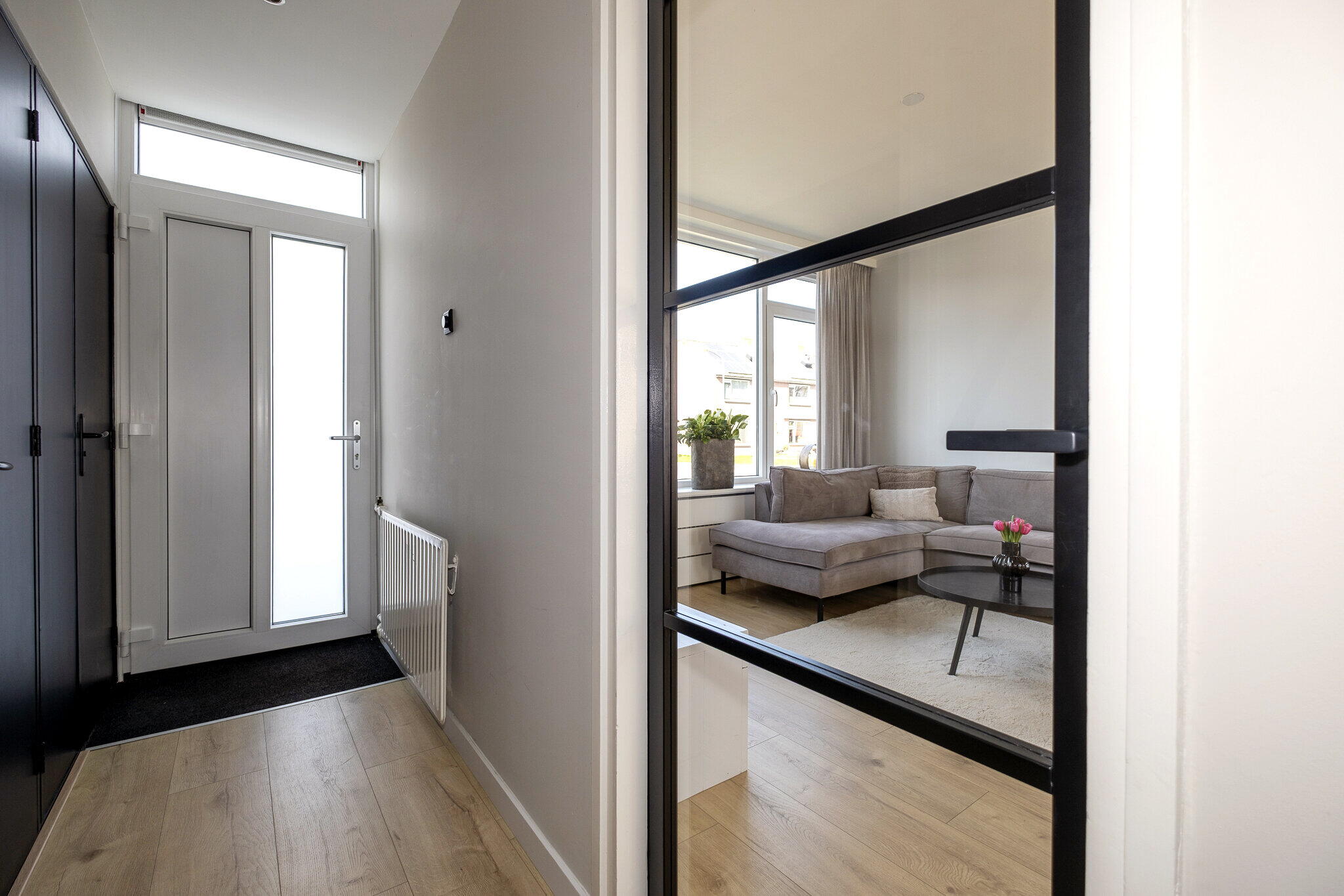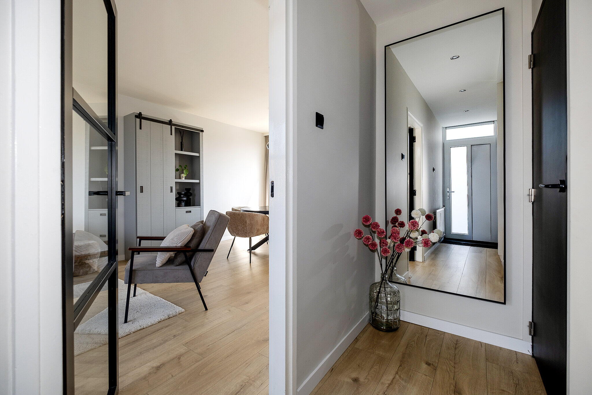 Via de entree kom je in de hal met toegang tot de verschillende vertrekken. De moderne woonkamer heeft een strakke afwerking en een prettige lichtinval, wat zorgt voor een aangename leefruimte.