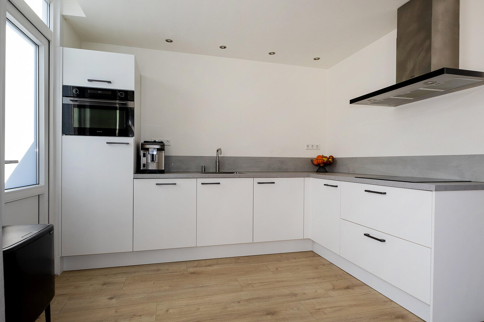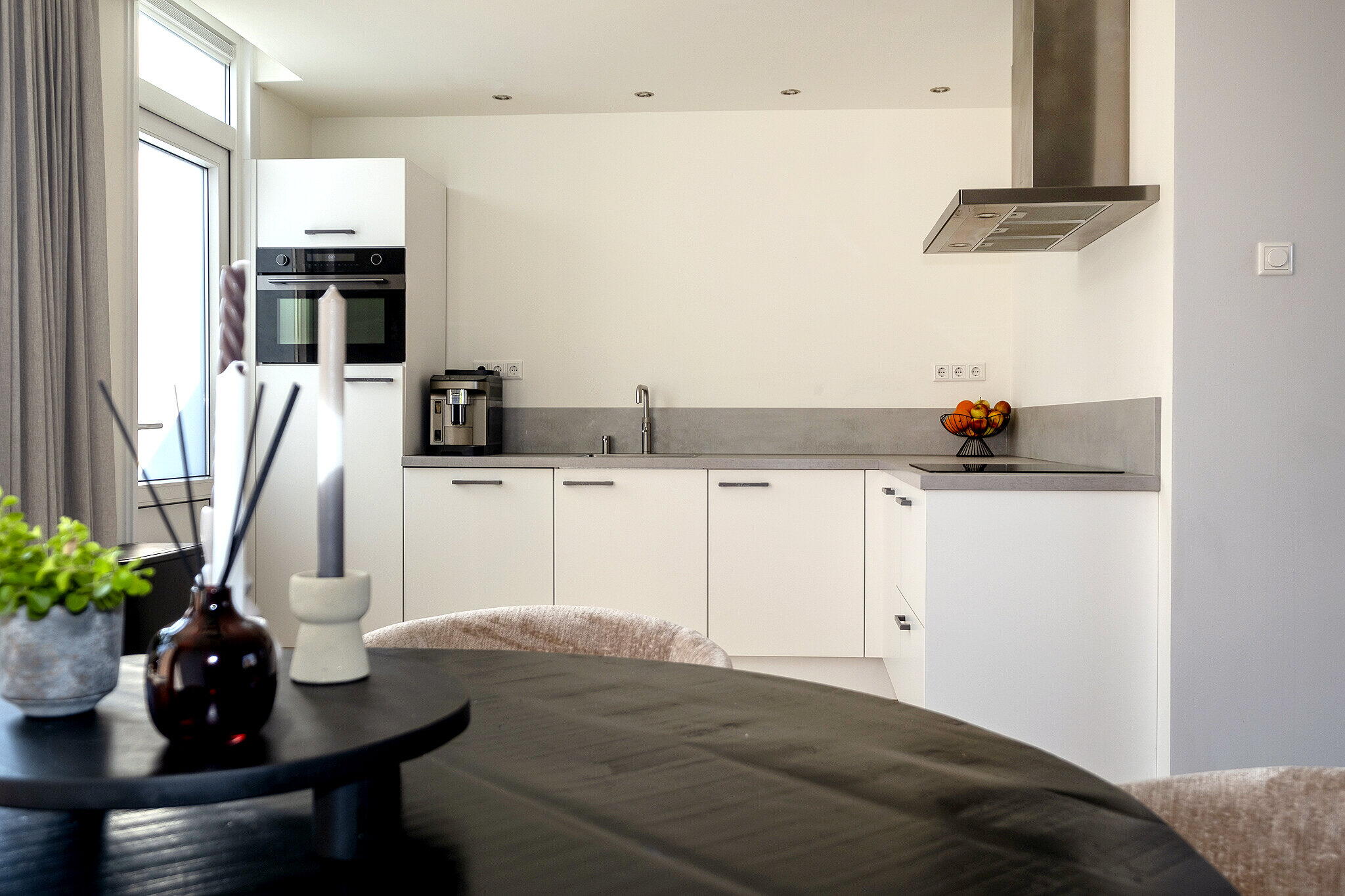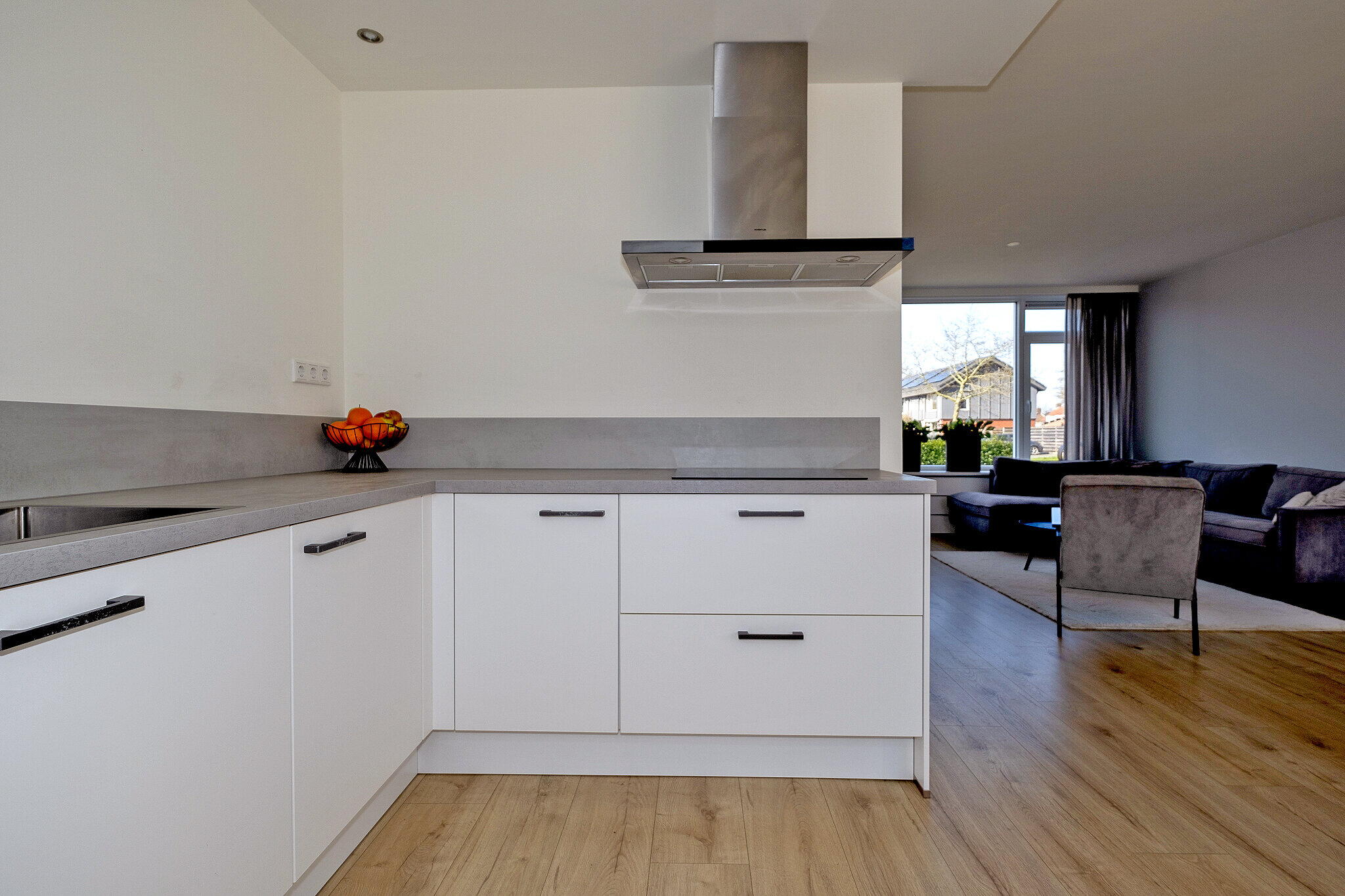 Aan de achterzijde van de woning bevindt zich de open keuken in een moderne kleurstelling met witte kastfronten. De keuken is voorzien van diverse inbouwapparatuur, waaronder een combi oven, koelkast, inductiekookplaat, afzuigkap, vaatwasser en een Quooker. Vanuit de keuken is er directe toegang tot de achtertuin.