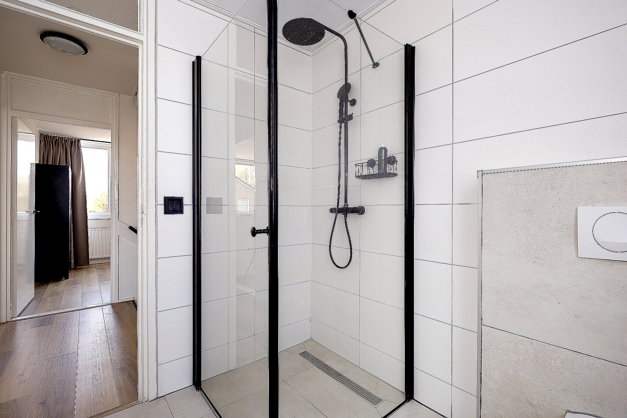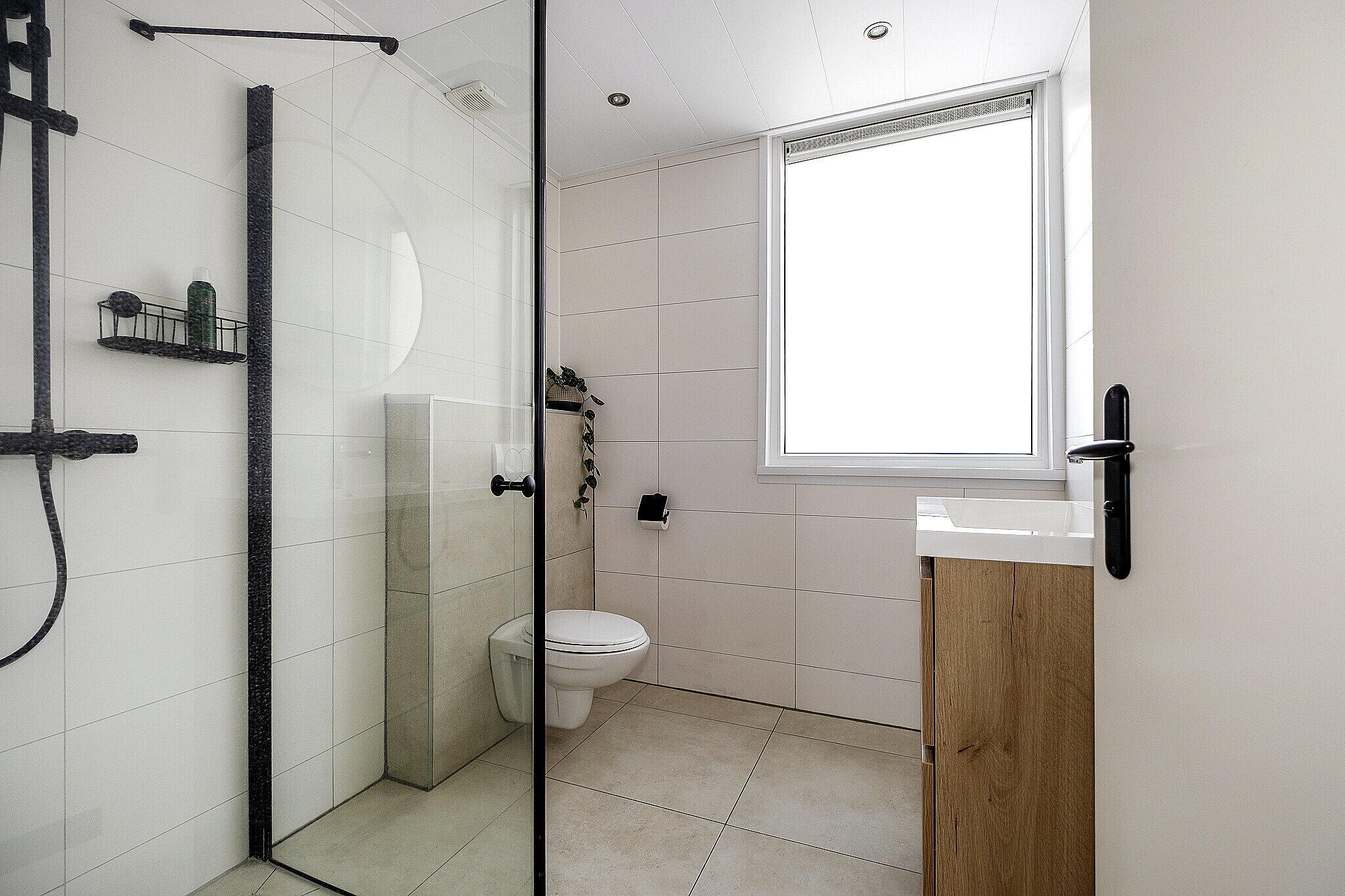 De badkamer is modern uitgevoerd en voorzien van een douche, toilet en een wastafelmeubel.
